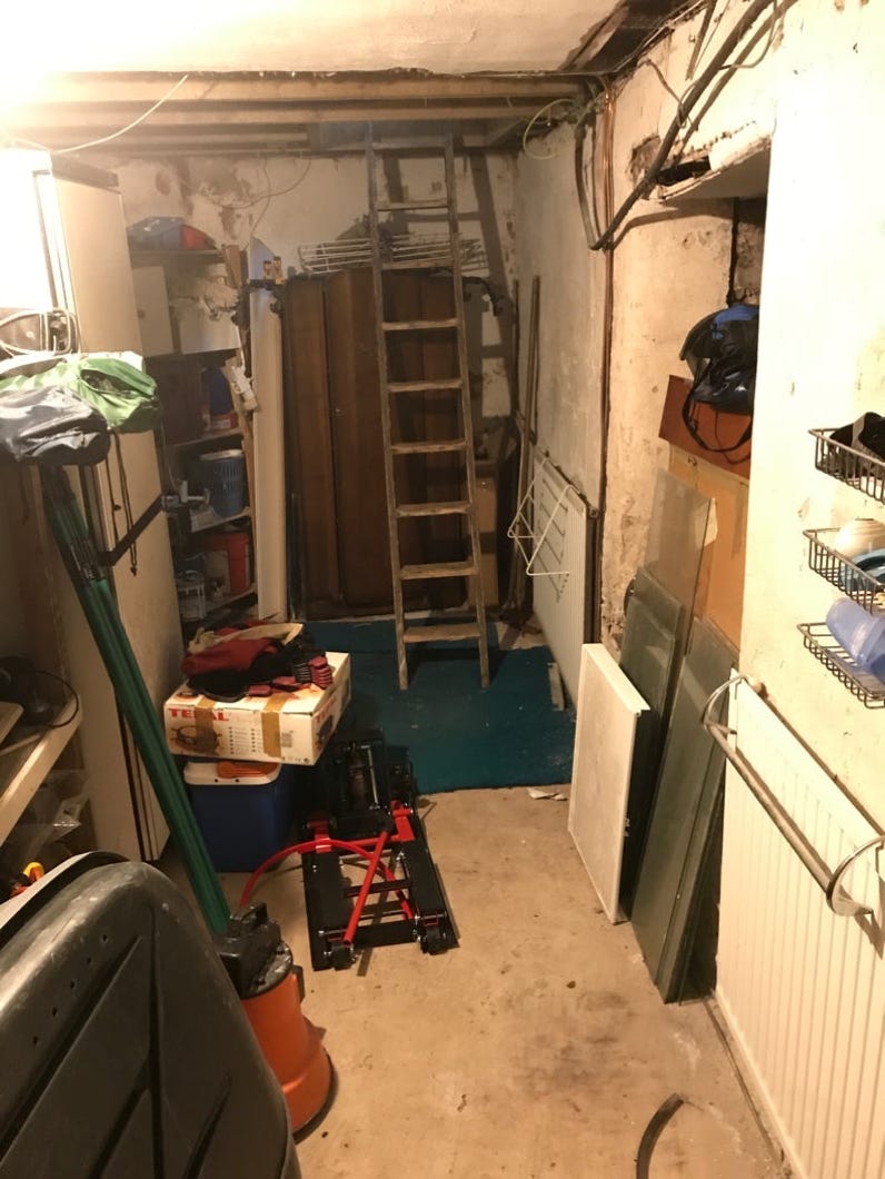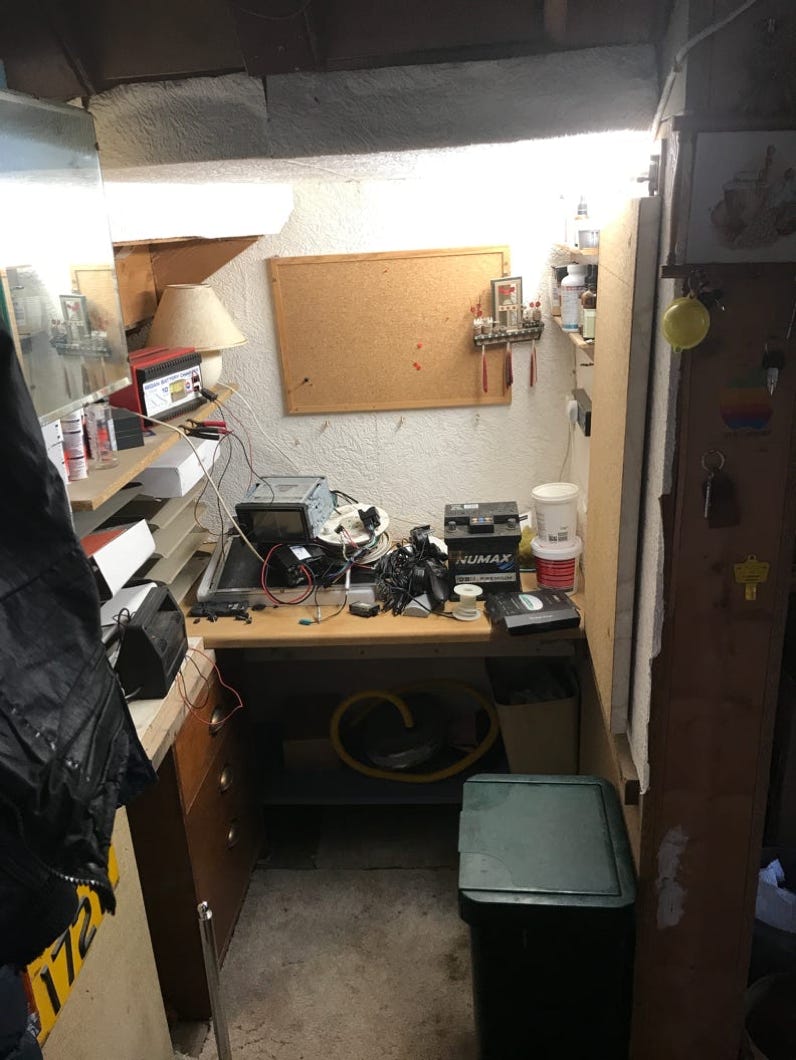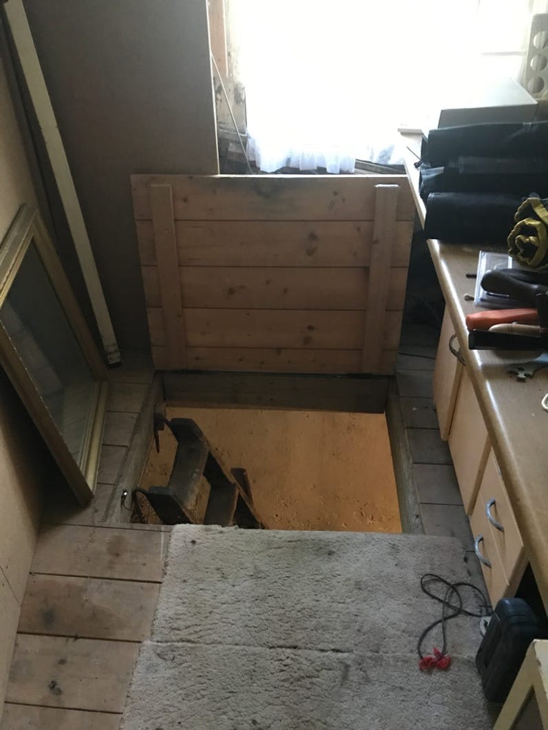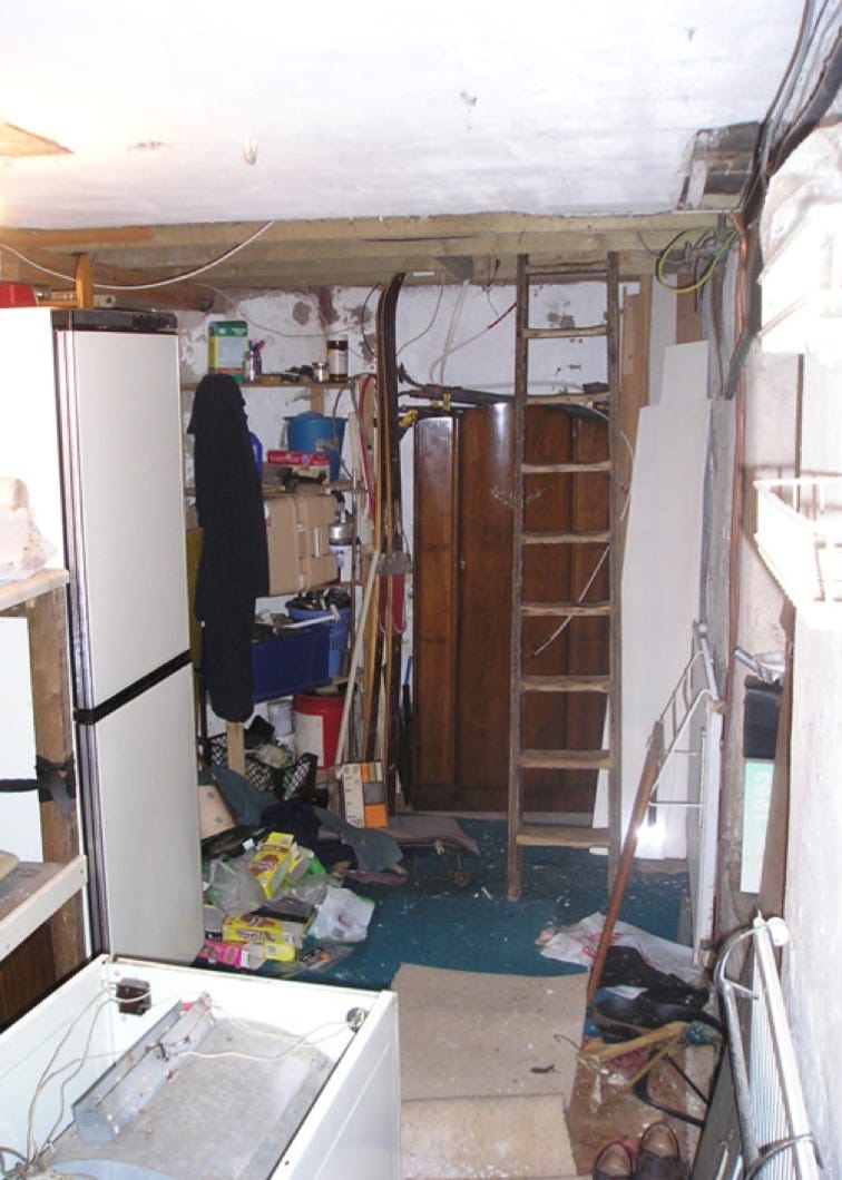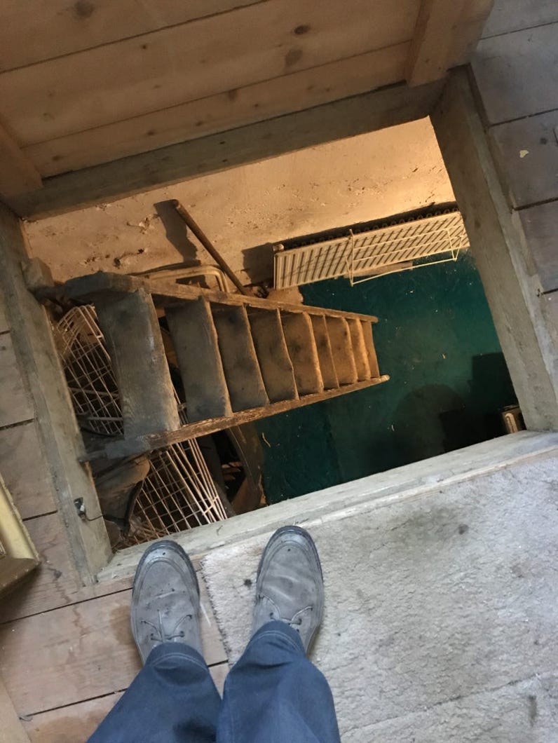 Above, ladders in workroom leading to basement via trapdoor in floor.